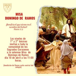 Los niveles de 1° y 2° básico invitan a toda la comunidad de los Sagrados Corazones a la solemne Misa de Domingo de Ramos, el día 10 de abril a las 11:00horas (bendición de Ramos patio central del colegio).